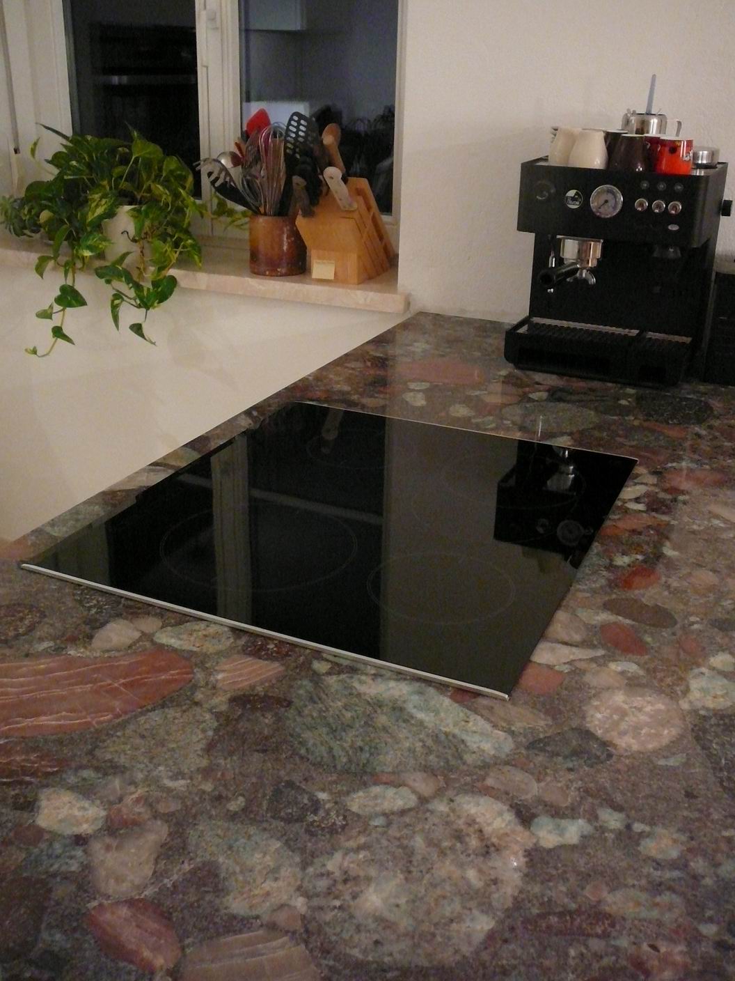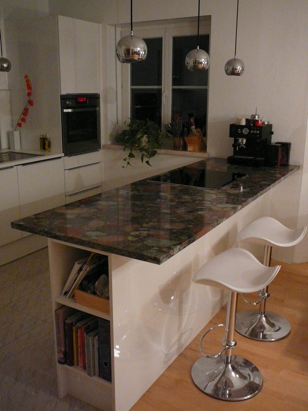 Der Eyecatcher dieser Küche ist wohl die Kochinsel, die mit dem sehr exklusiven Material Aquarius Blue gestaltet worden ist. Um ihre Wirkung nicht zu stören wurden die Arbeitsplatte im Bereich des Waschbeckens dezent mit einem weißen Material im Stil der Küchenmöbel verarbeitet. So wirkt der Konglomerat aus Brasilien nicht zu dominant.