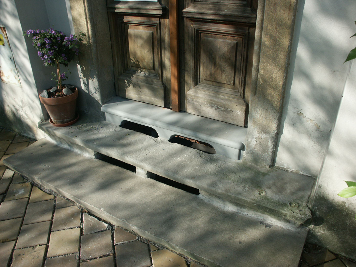 Der Austausch einer historischen Stufe aus „Neustifter Sandstein“ (Maria Neustift Slowenien – unter Marburg) war mit dem Originalstein nicht möglich, da der Steinbruch nicht mehr betrieben wird. Als Alternative haben wir den italienischen Stein „Pietra Serena“ gewählt und damit versucht, das ursprüngliche Erscheinungsbild zu wahren.