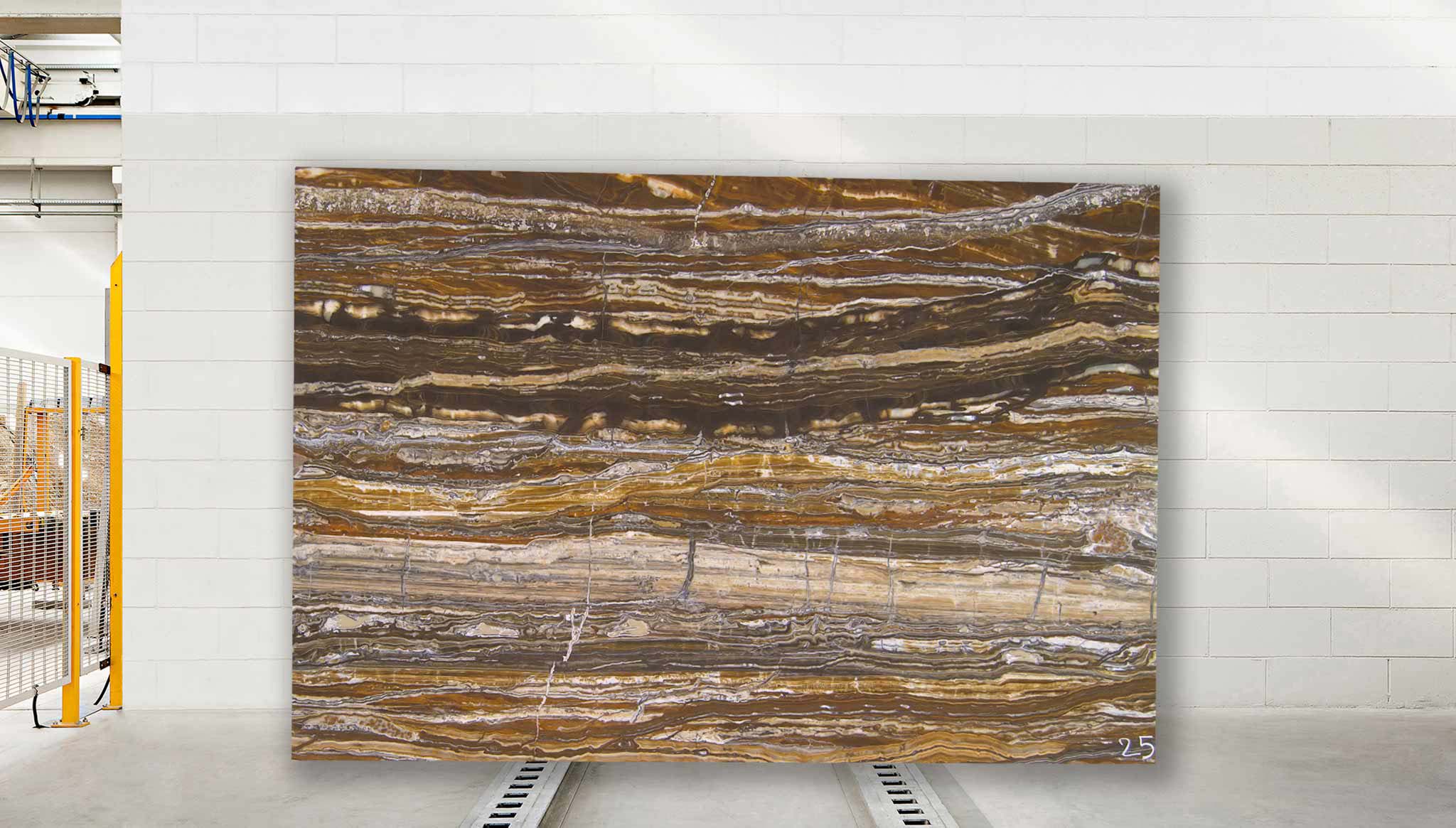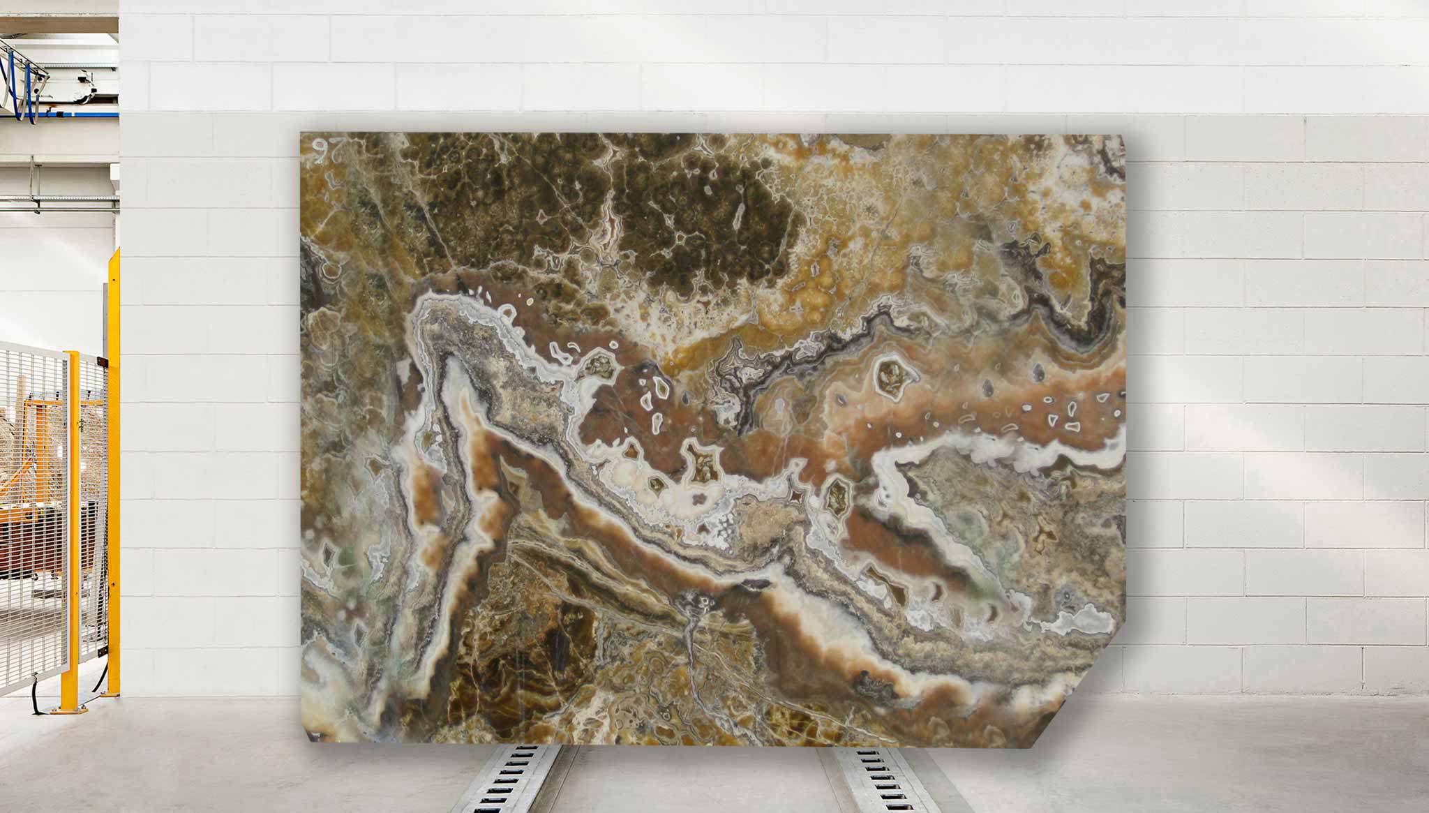 Der braune Onyx aus den USA ist durch seine gewolkte Struktur besonders für einzigartige Anwendungen im Innenbereich geeignet. Das Material ist durch seine Transparenz besonders geeignet für hinterleuchtete Objekte und verleiht jedem Raum einen Hauch von Exklusivität.