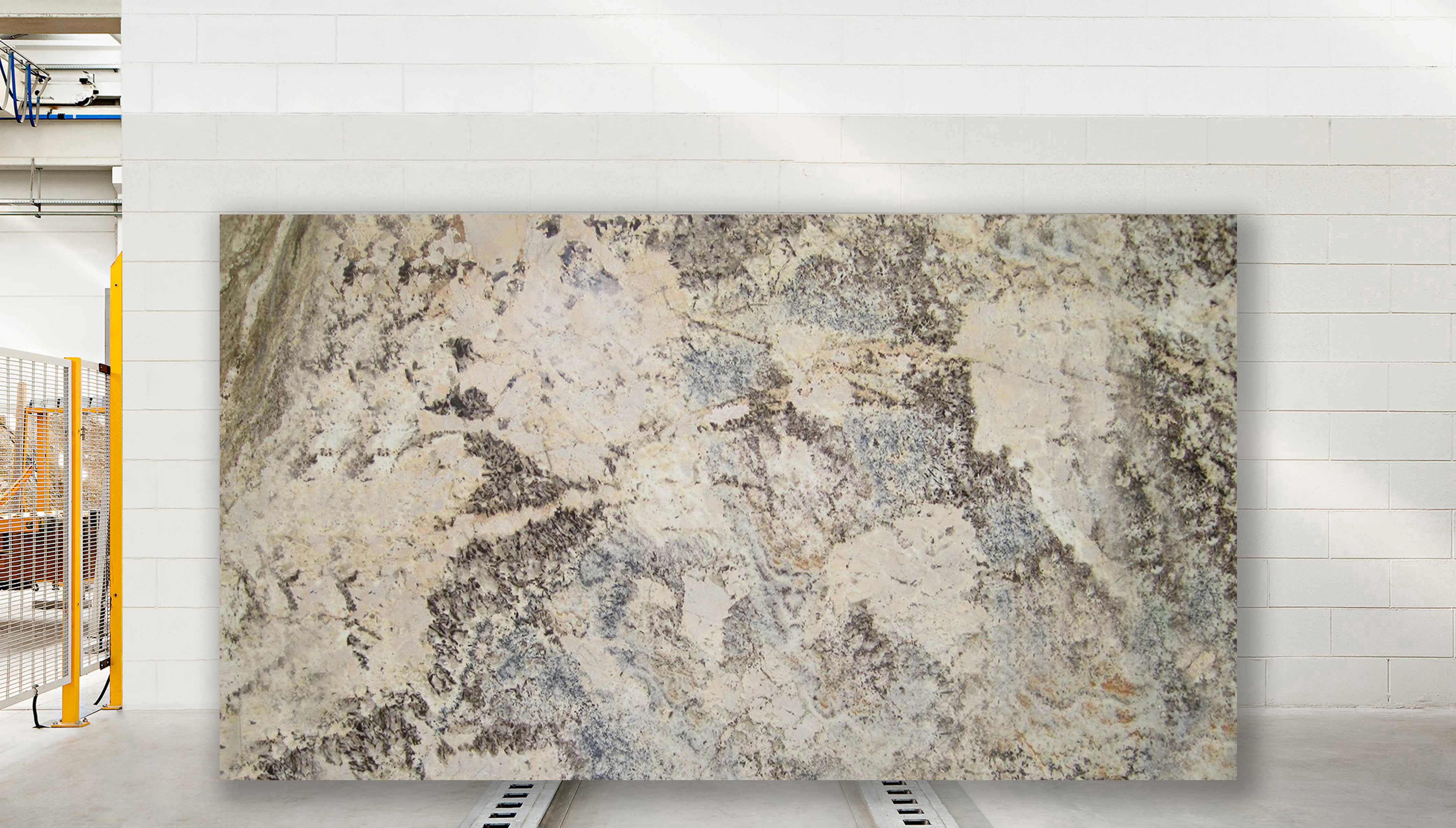 Aufgrund seiner bewegten Struktur ist jede Platte des beigeblauen Granits aus Brasilien einzigartig – wie ein Kunstwerk der Natur. Dank seiner Säurebeständigkeit eignet sich das Material unter anderem auch sehr gut für Küchenarbeitsplatten und viele andere Anwendung im Innen- und bedingt im Außenbereich.