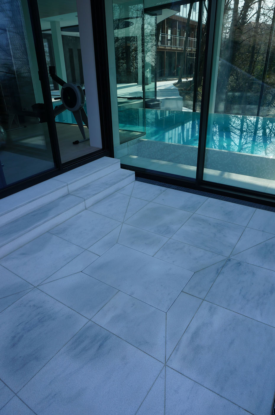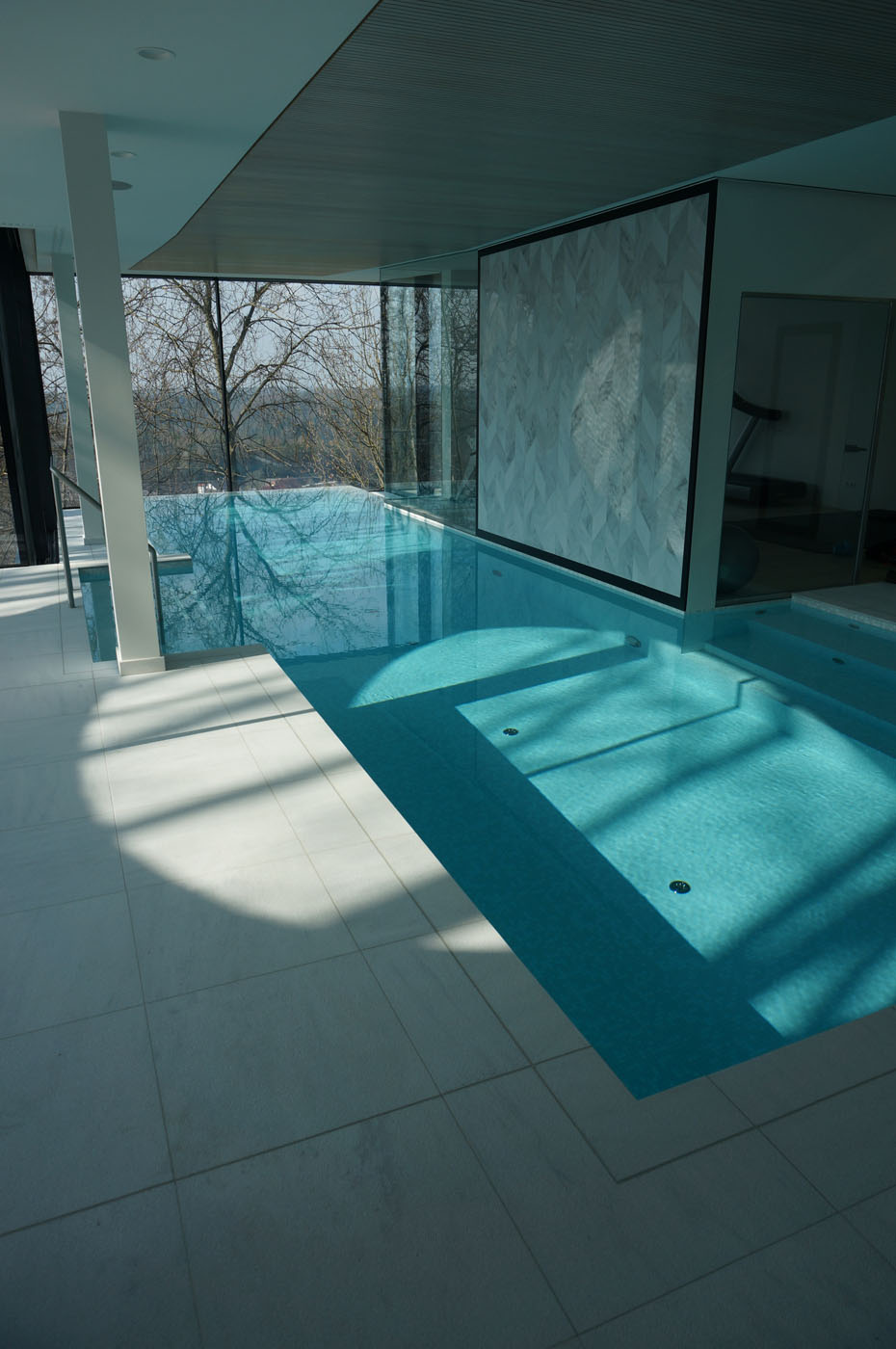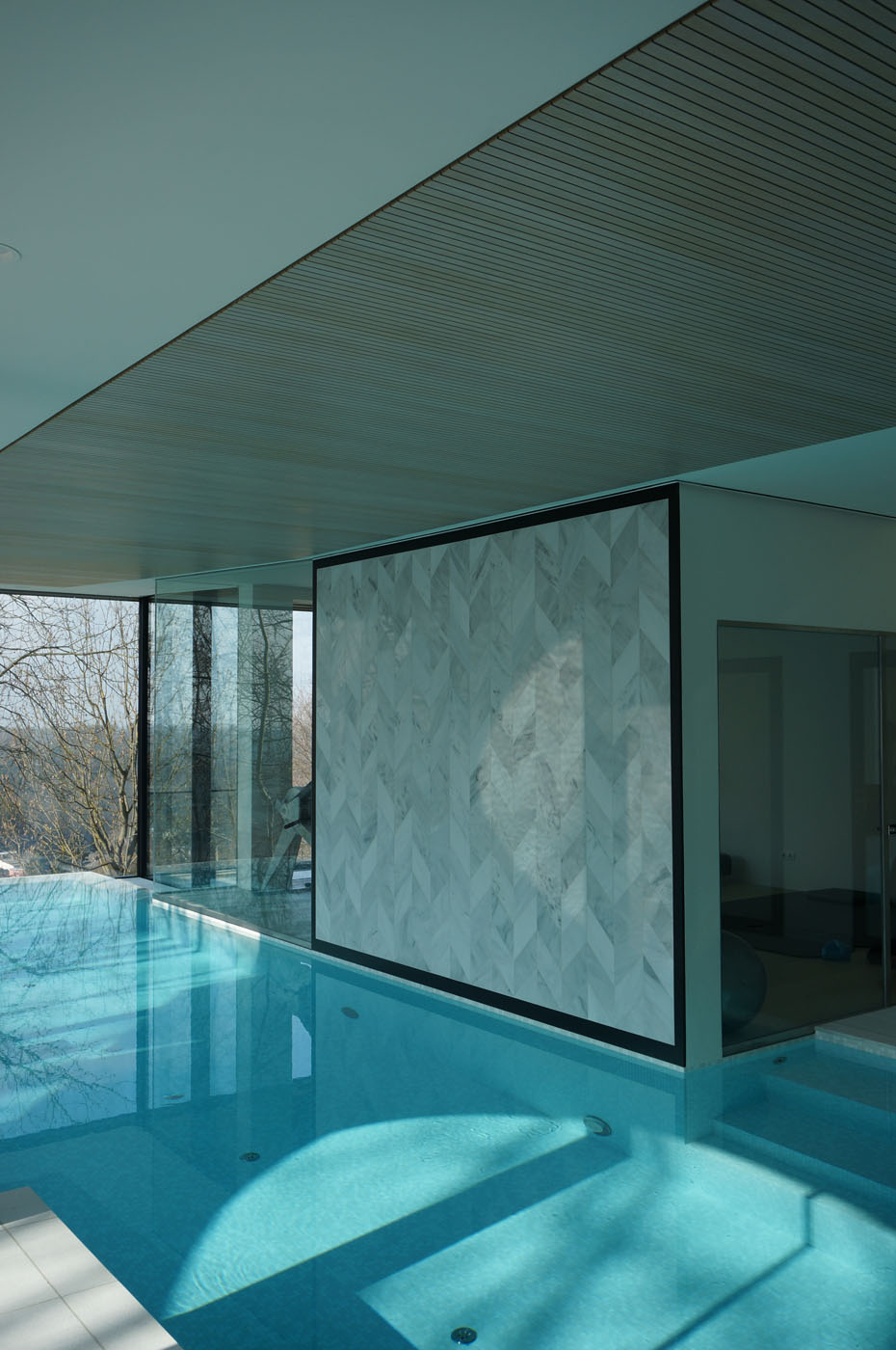 Der Kristallmarmor in sandgestrahlter Oberfläche wurde als Grundmaterial für dieses Hallenbad ausgewählt. Die Wandscheibe beim Pool wurde mit dem gleichen Stein – aber mit insgesamt fünf verschiedenen Oberflächen und im rautenförmigen Format – verkleidet. Um auch den ständigen Kontakt des Marmors mit dem chlorhaltigen Wasser zu vermeiden, wurde diese Wandscheibe mit einem schwarzen Quartzkompositmaterial eingefasst.