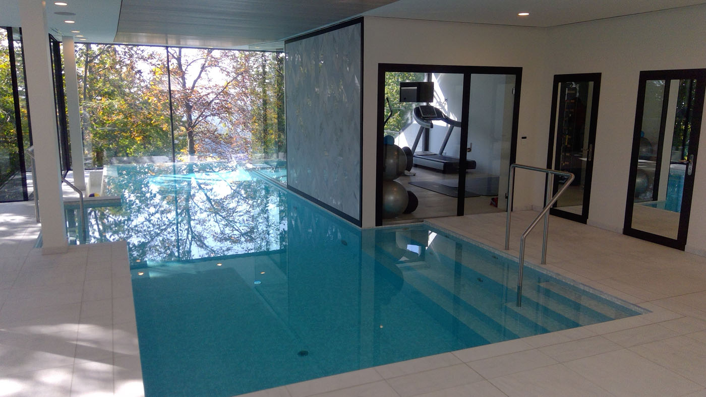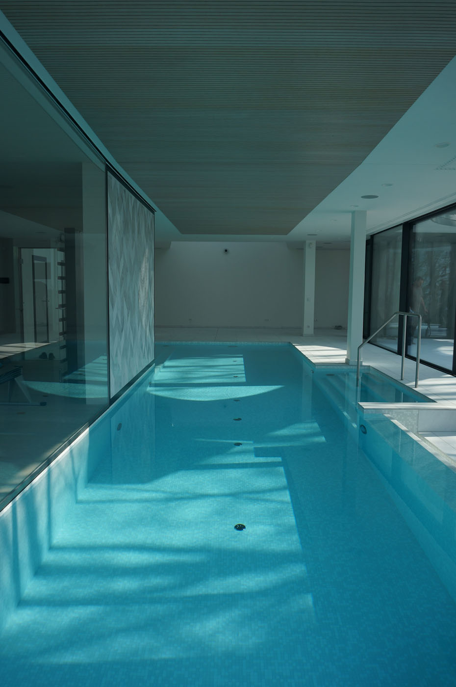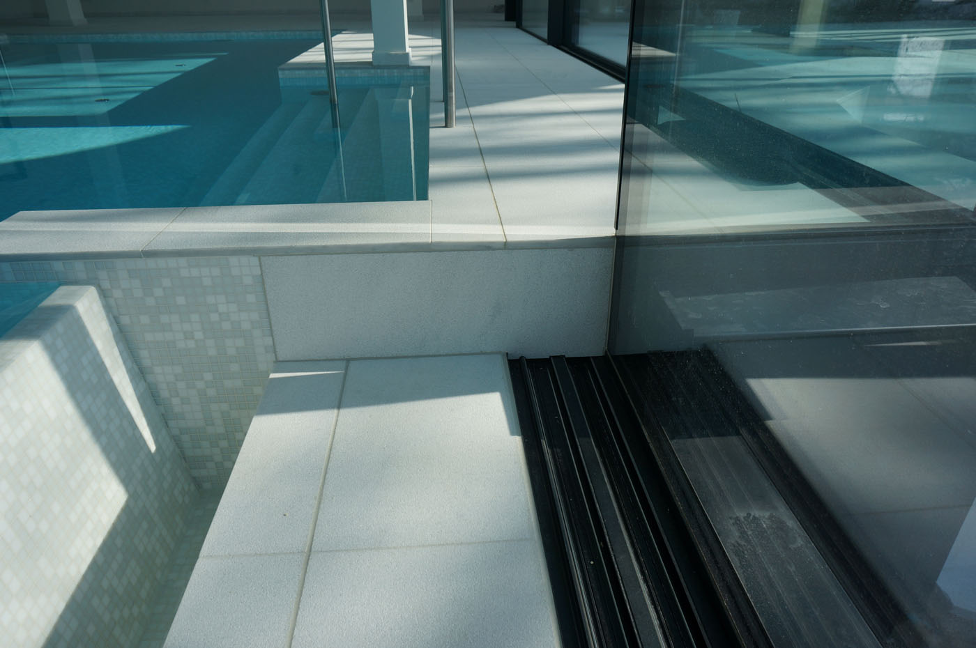 Der Kristallmarmor in sandgestrahlter Oberfläche wurde als Grundmaterial für dieses Hallenbad ausgewählt. Die Wandscheibe beim Pool wurde mit dem gleichen Stein – aber mit insgesamt fünf verschiedenen Oberflächen und im rautenförmigen Format – verkleidet. Um auch den ständigen Kontakt des Marmors mit dem chlorhaltigen Wasser zu vermeiden, wurde diese Wandscheibe mit einem schwarzen Quartzkompositmaterial eingefasst.