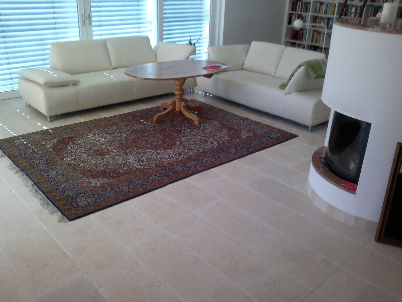 In diesem Grazer Wohnhaus haben wir sämtliche Bodenflächen mit dem Türkischen Kalkstein „Siena“ (Oberfläche gebürstet) verlegt.