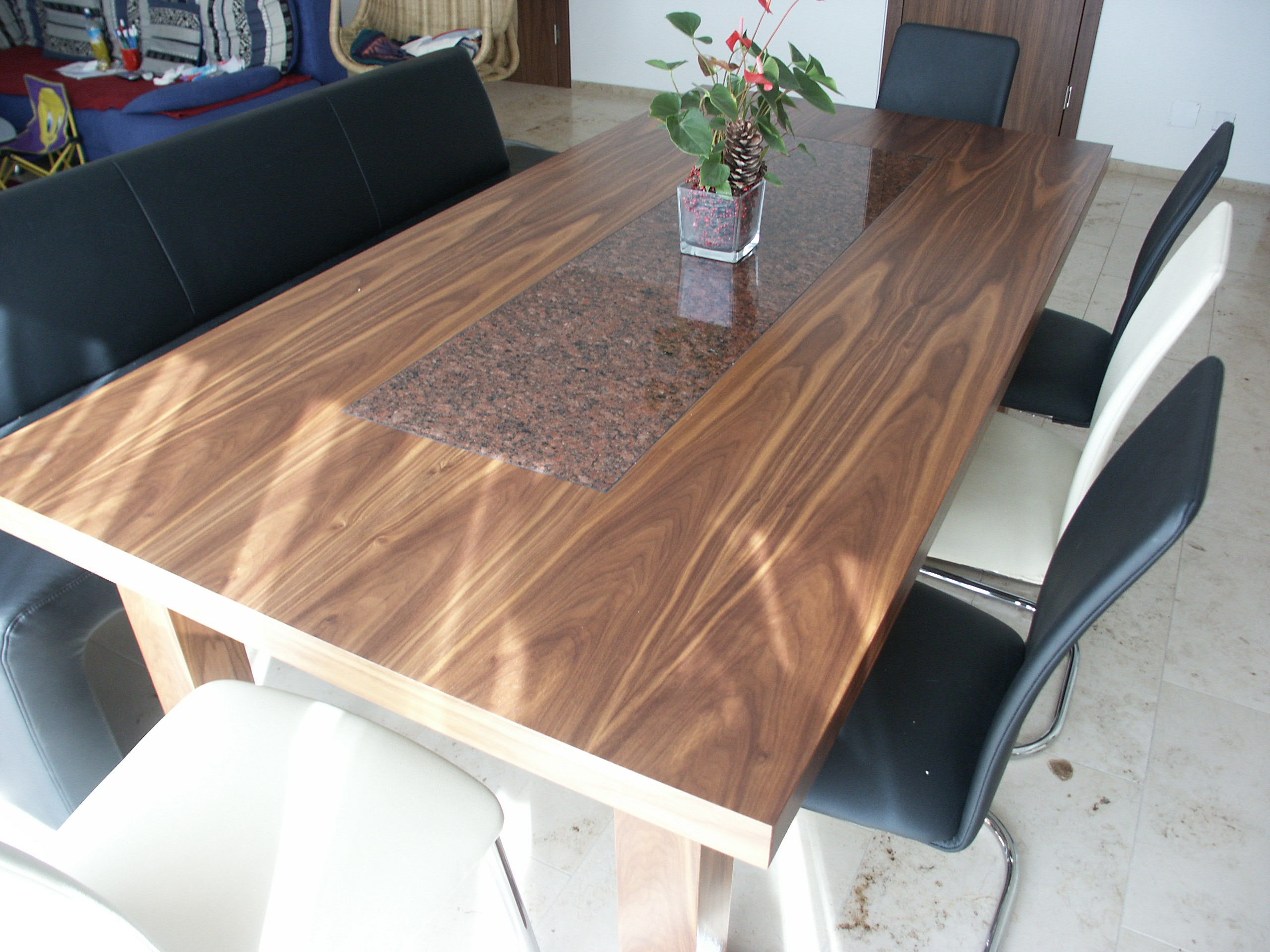 Nicht alles muss aus Stein sein: In einem Privathaus realisierten wir einen Esstisch, der fast gänzlich aus Nussholz besteht und in der Mitte der Tischplatte ein langes Element aus Vanga Granit flächenbündig integriert hat. Das Design hat auch einen praktischen Mehrwert, da heiße Speisen und Metalltöpfe problemlos auf den widerstandsfähigen Stein gestellt werden können und so das Holz nicht beschädigt wird. Die Küchenarbeitsplatte fertigten wir ebenfalls aus diesem Naturstein und stellten somit eine Verbindung zum Esstisch her.