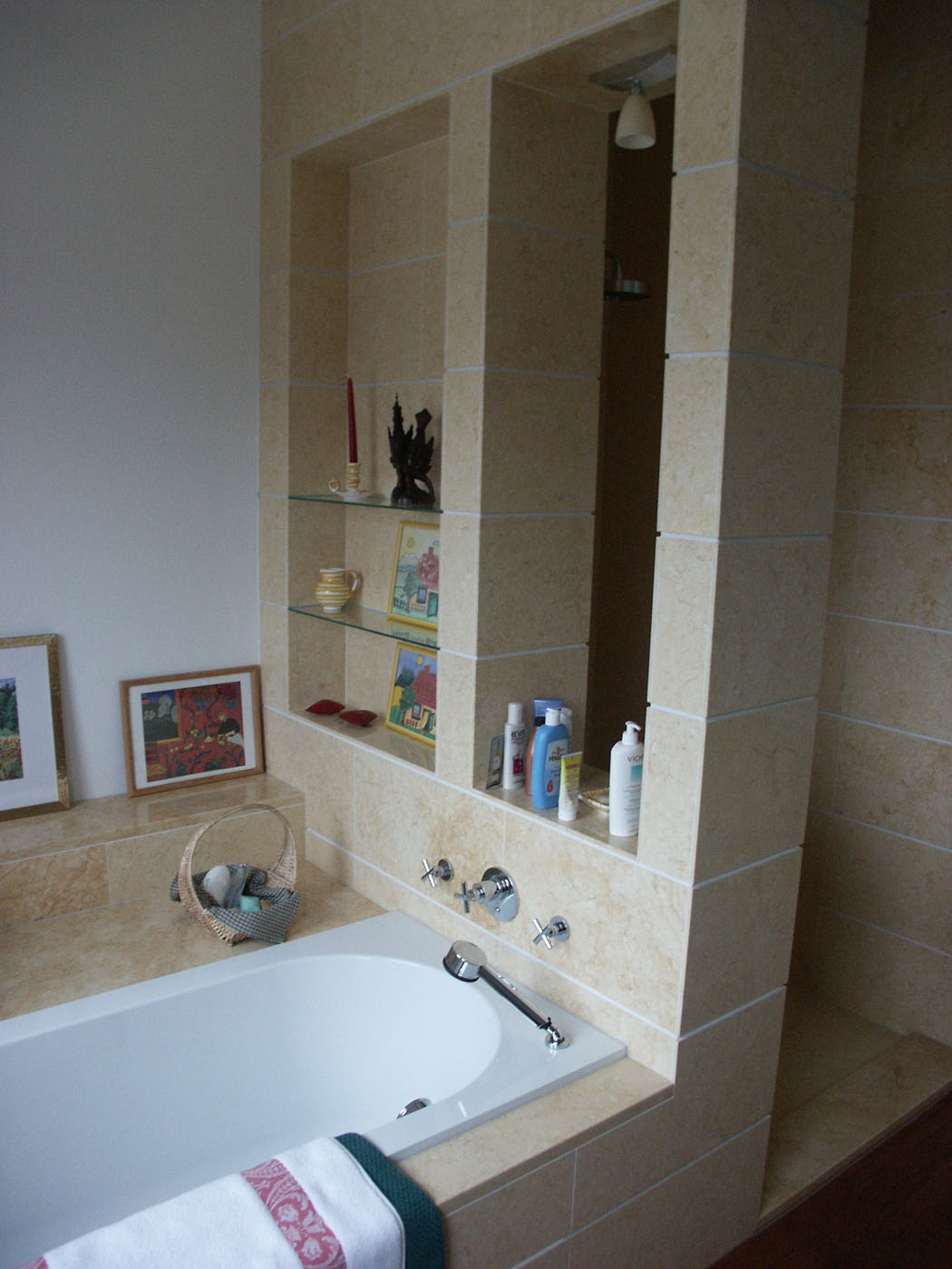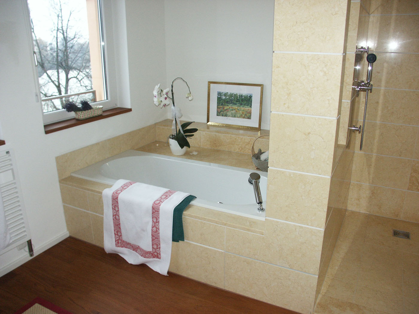Bei diesem exklusiven Badezimmer haben wir Parkettboden und Naturstein kombiniert. Eine zusätzliche optische Aufwertung erhielt die Wandverkleidung mit der Ausführung von ca. 1cm breiten und sehr tiefen Fugen.