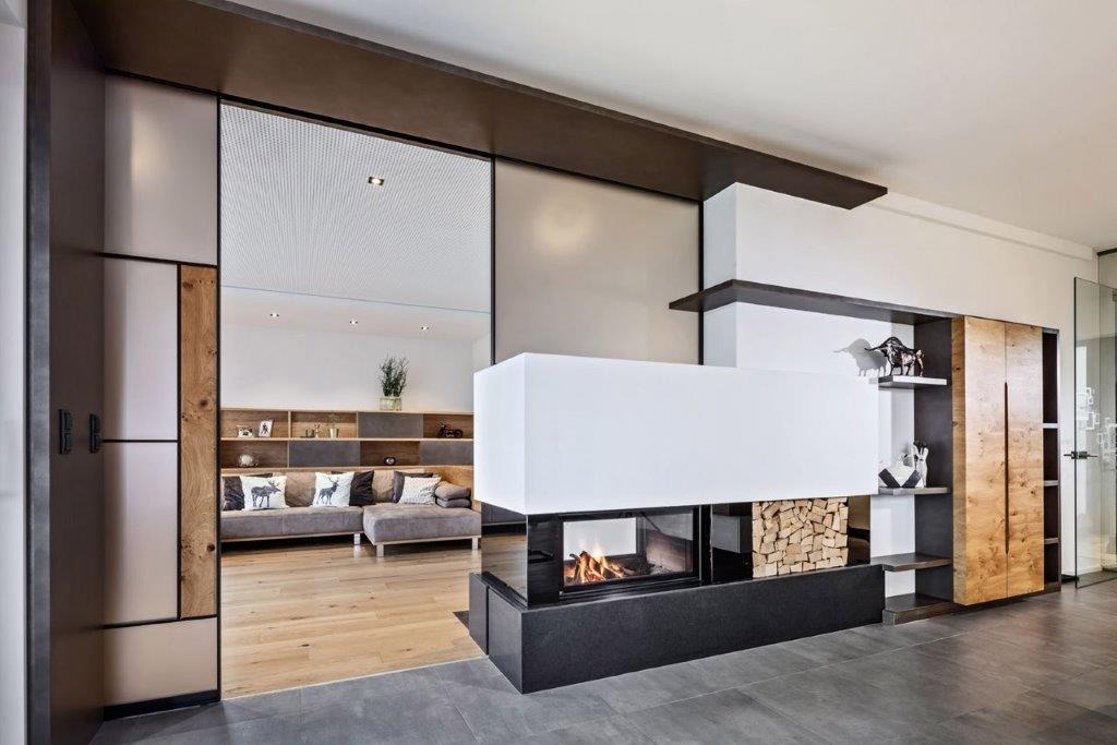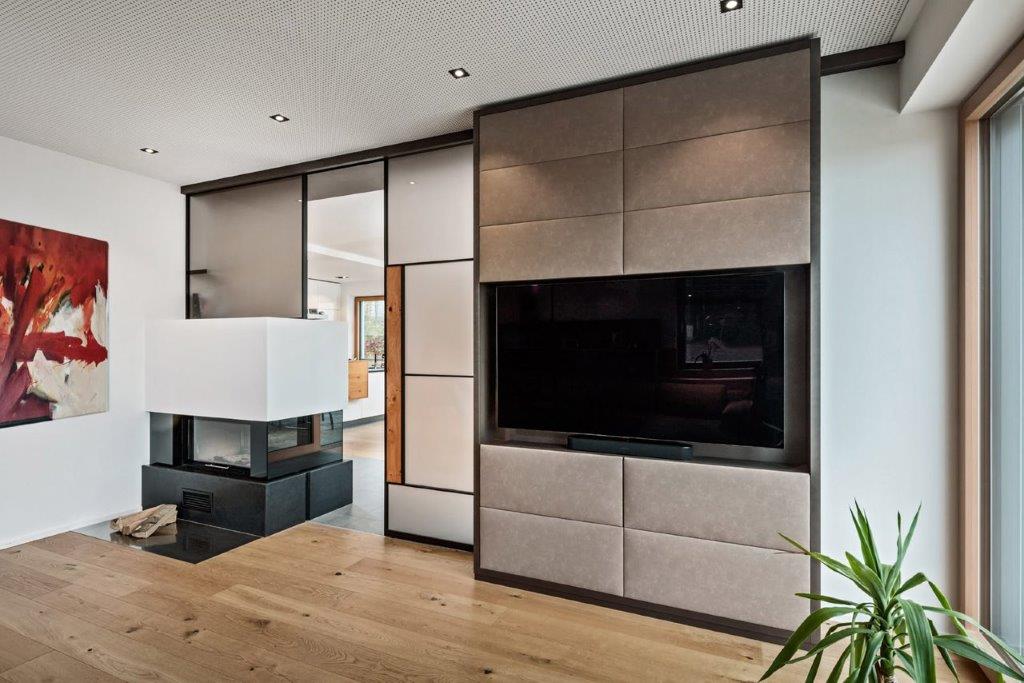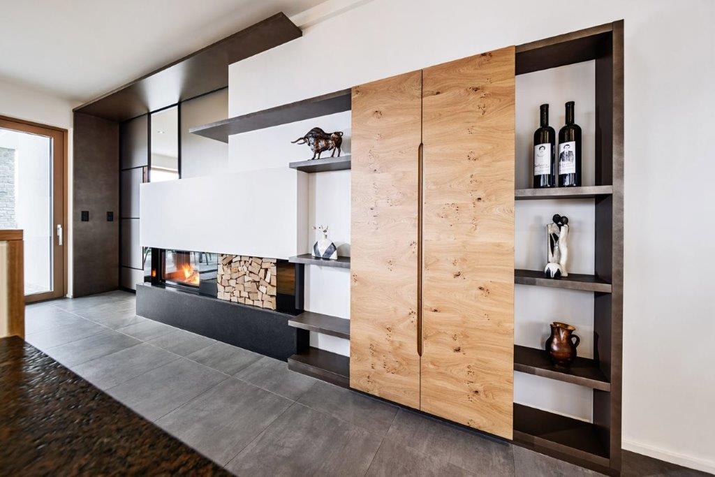 Zeitlos und elegant: Der Kaminsockel, den wir hier mit dem schwarzen „Nero Assoluto“ (satinierte Oberfläche) verkleiden durften, fügt sich nahtlos ins geradlinige Design des Wohnbereichs ein und schafft eine wohnliche Atmosphäre.