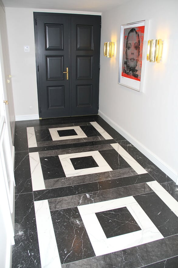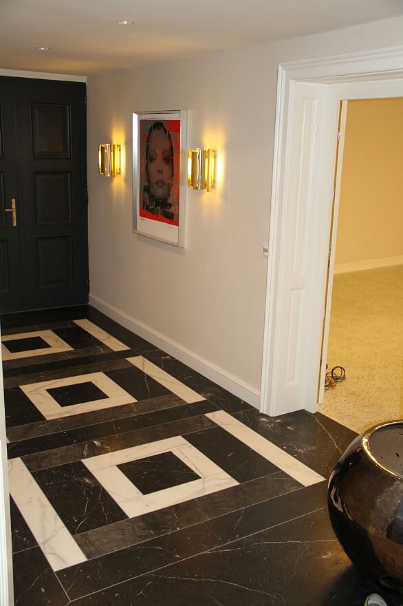 Durch die kreative monolitische Gestaltung des Eingangsbereichs kommt jedes der eingesetzten Materialien zur Geltung. Die Einzigartigkeit der Formate bzw. der Zeichnung zeigt die kreative Gestaltungsmöglichkeit von Böden. Zum Einsatz kamen hier Nero Magnina, Tassos und Grigio Carnico.