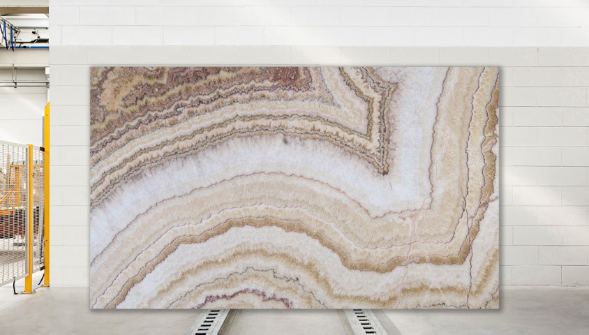 Der beige Onyx aus China besitzt eine gewolkte Struktur und ist durch seine Transparenz besonders geeignet für hinterleuchtete Objekte im Innenbereich und verleiht jedem Raum einen Hauch von Exklusivität.