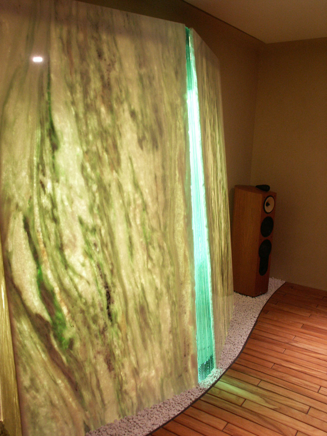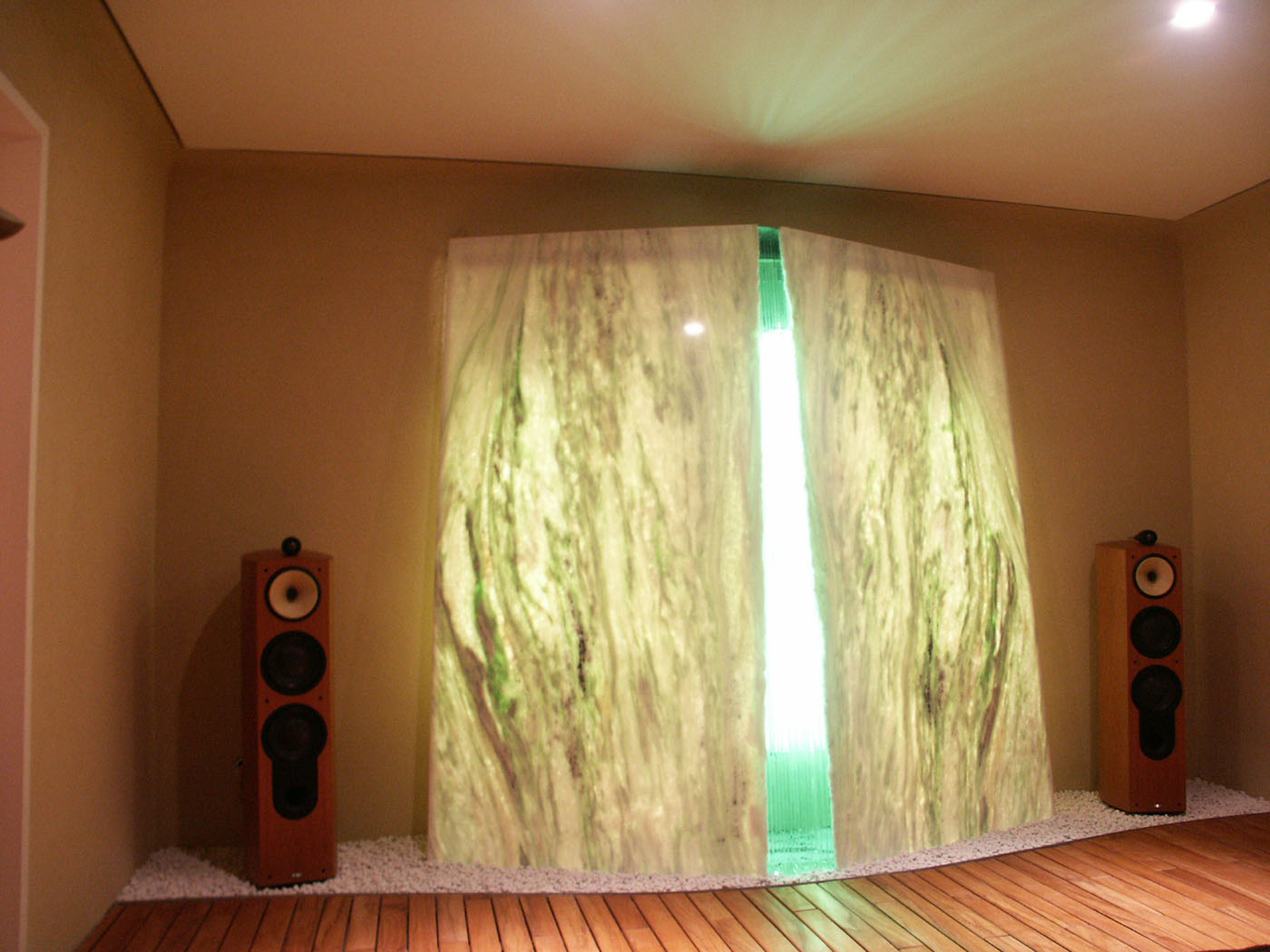Da viele Marmor bzw. Gesteinsarten ab einer bestimmten Dicke transluzent sind, können wir viele Effekte mit der Beleuchtung erzielen. Hier wurde für einen Musikfreund sein Ruheraum mit einer hinterleuchteten „Lemone“-Marmorplatte und einer hochwertigen HIFI-Anlage gestaltet.