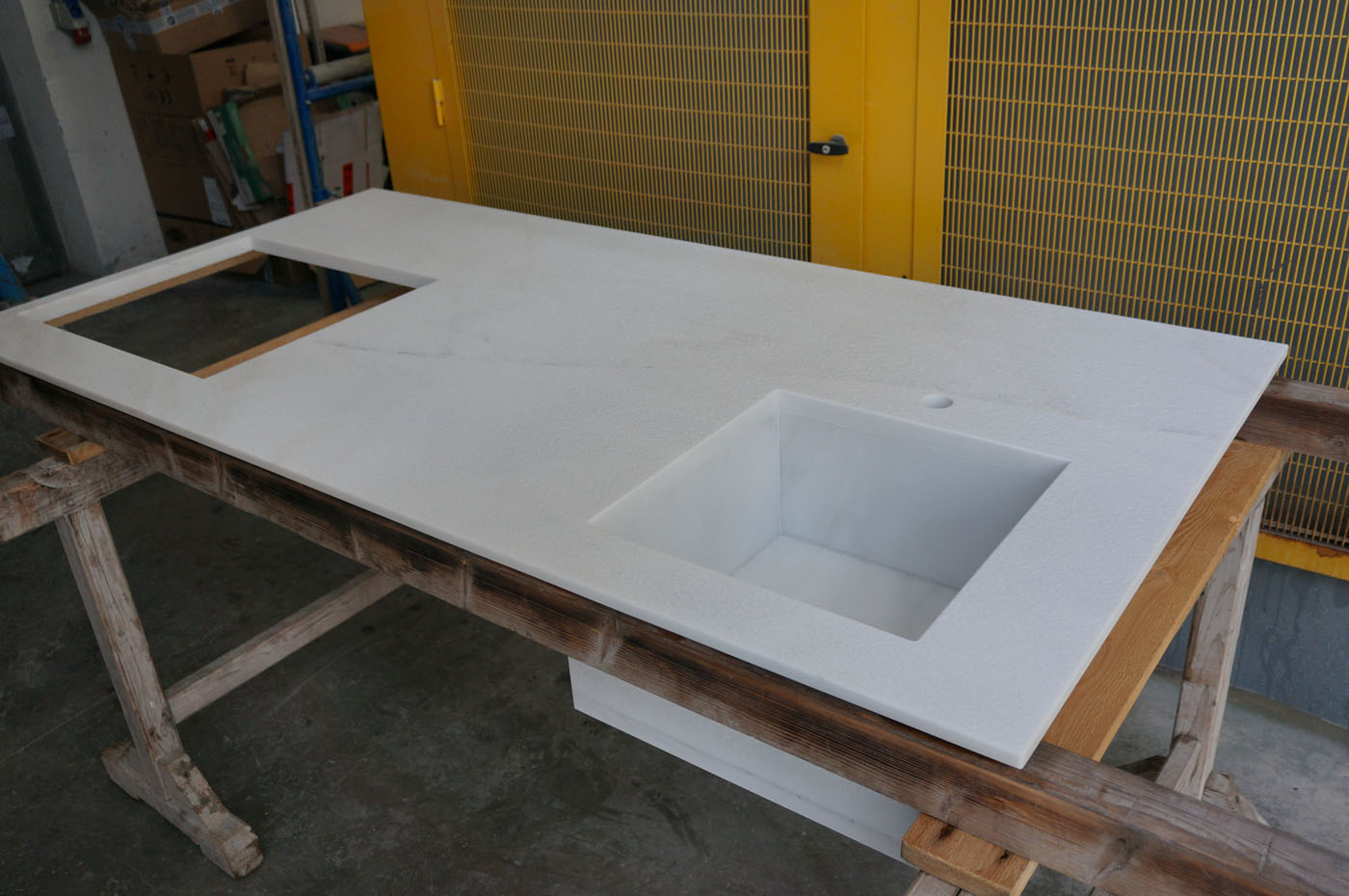 Diese sehr grob gestockte und danach gebürstete Arbeitsplatte wurde in einem Wochenendhaus in der Südsteiermark eingebaut. Der Salzburger Marmor „Rauriser“ ist durch die hohe Qualität auch für diesen Arbeitsbereich geeignet. Bitte beachten Sie wie immer die speziellen Pflegehinweise für Marmor und holen Sie bei diesem Material unbedingt die Meinung eines Fachmann ein. Wir beraten Sie gerne!