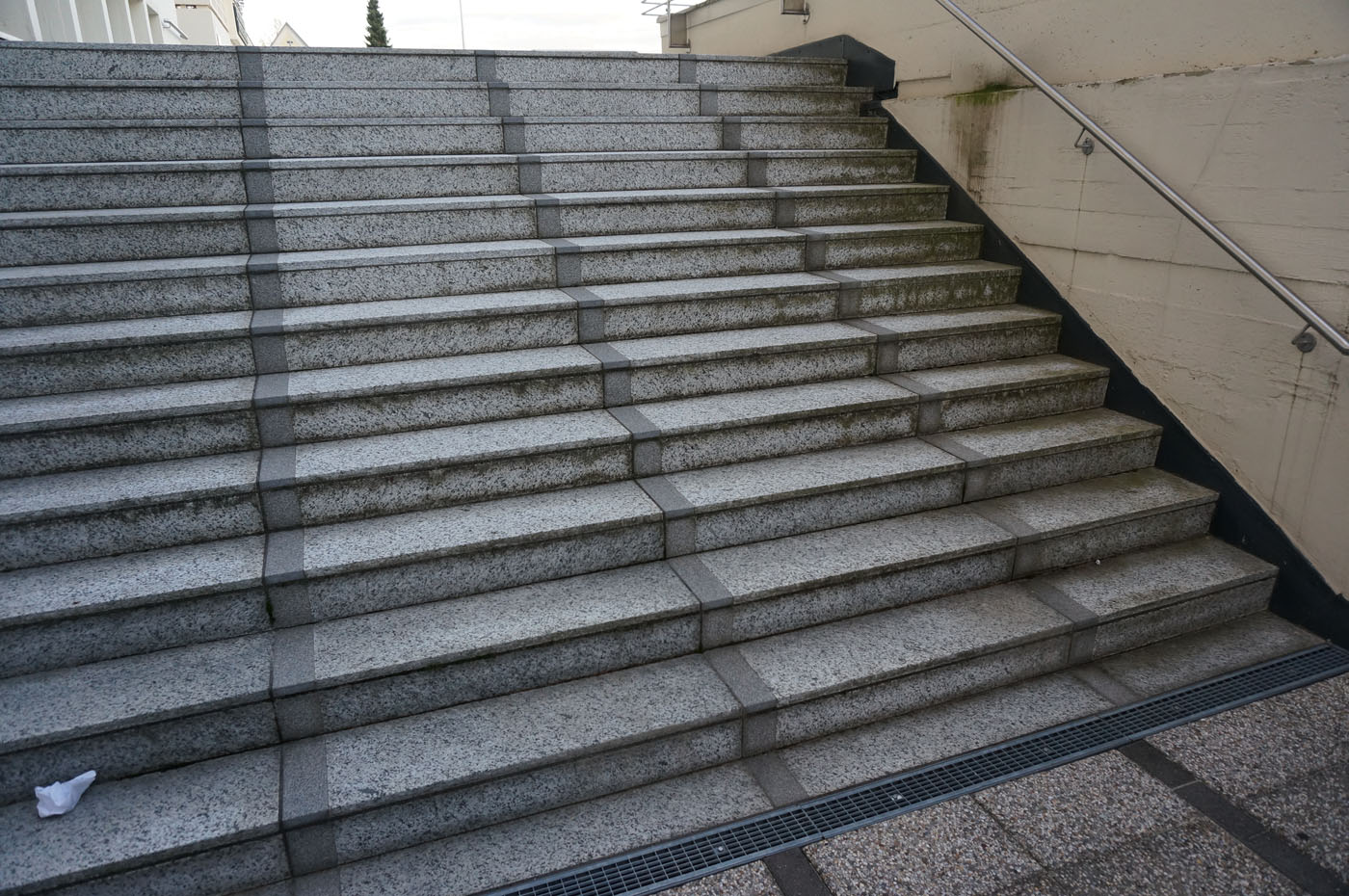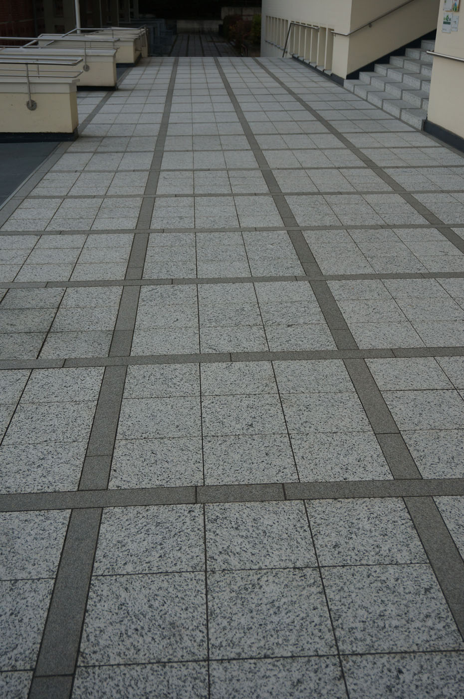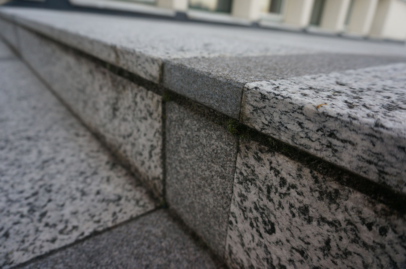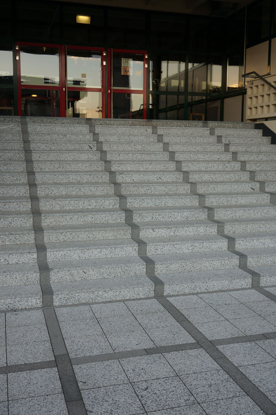 Beim BRG Weiz musste aufgrund von Wassereintritt in den unteren Räumlichkeiten der Naturstein ausgelöst und nach den Abdichtungsarbeiten wieder nach neustem Stand der Technik verlegt werden. Der Bodenaufbau setzte sich wie folgt zusammen: bituminöse Abdichtung, Gummigranulatmatte als Schutz, zur Drainagierung bzw. zum Wasserablauf eine Drainagematte, Drainagemörtel und 3cm Stein – im Gefälle von 2 Prozent. Um die Architektur nicht zu stören, haben wir diese zweifarbige Verlegung trotz Mehraufwand wieder eingebaut.